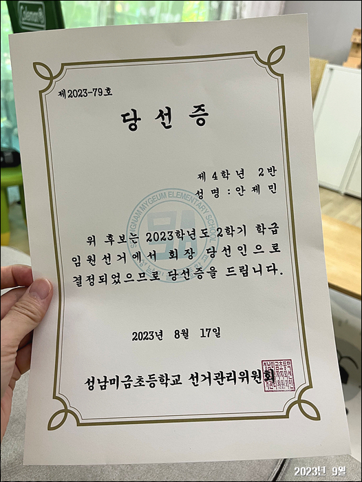 2학기 나가서 회장이 되어서 오늘 당선증을 받아왔네~ 대견하고 기득하고 자랑스러운 내딸!!