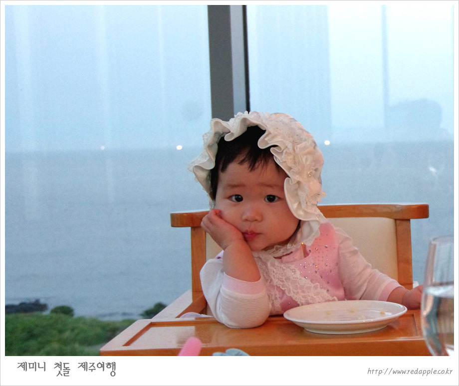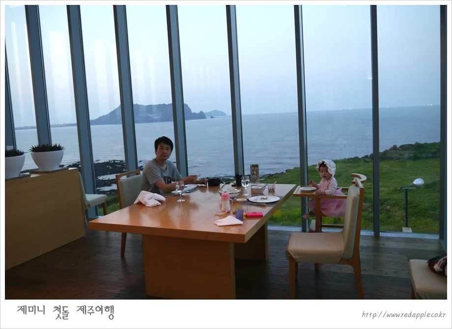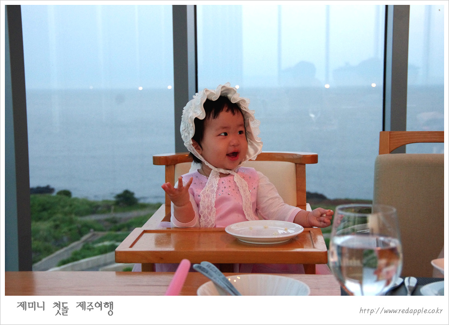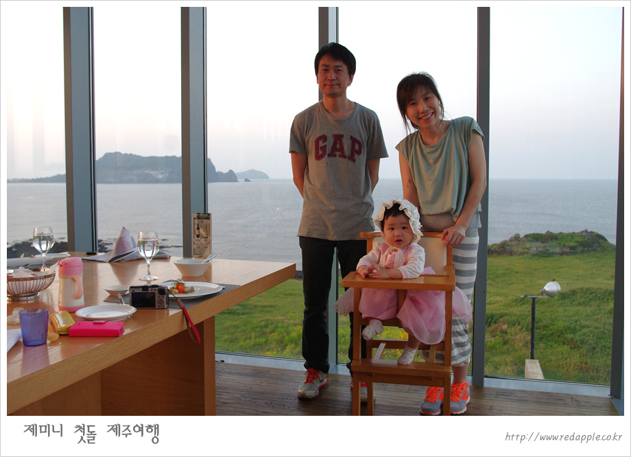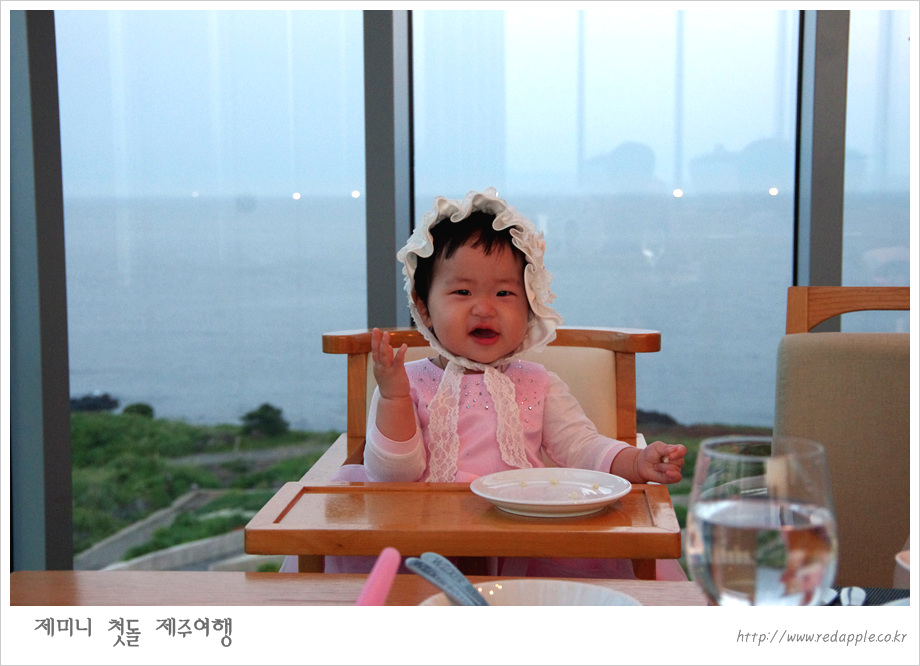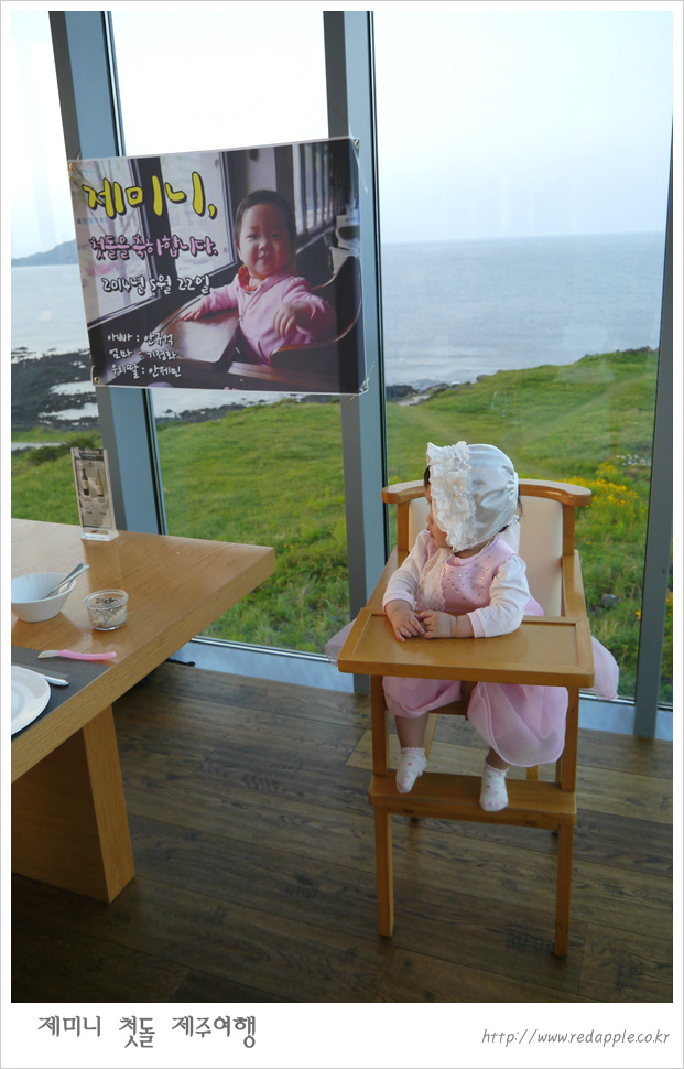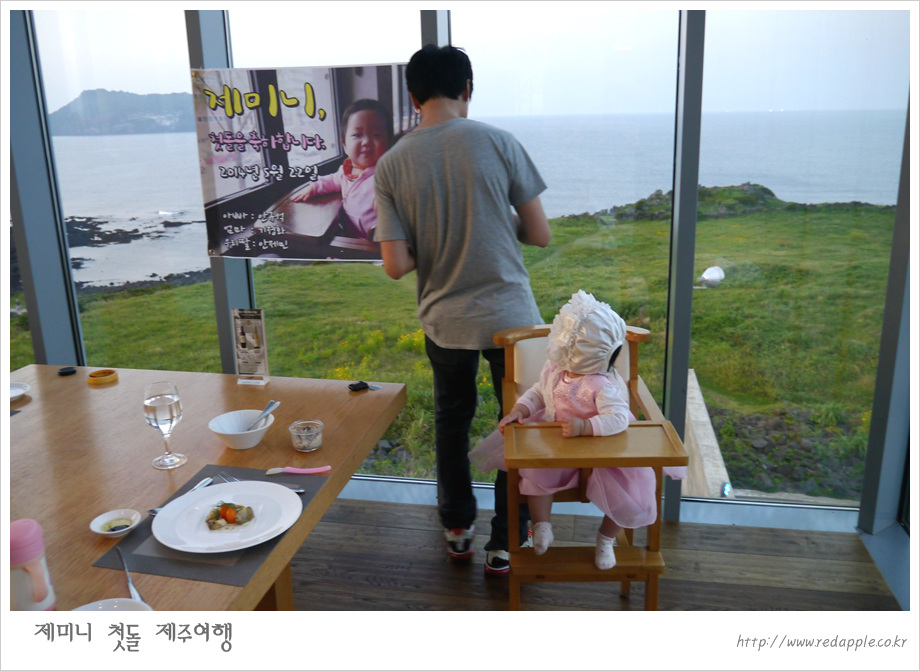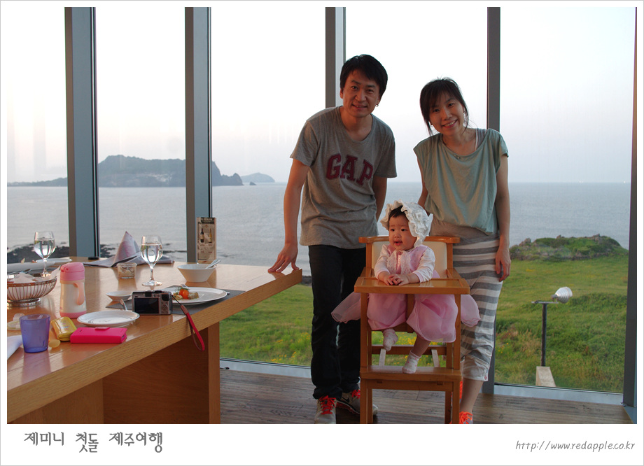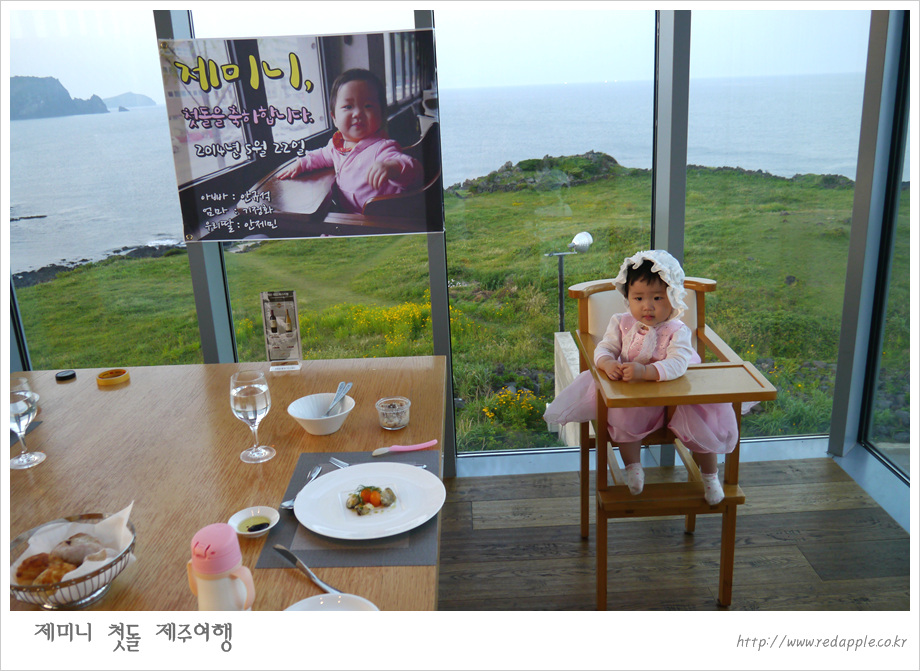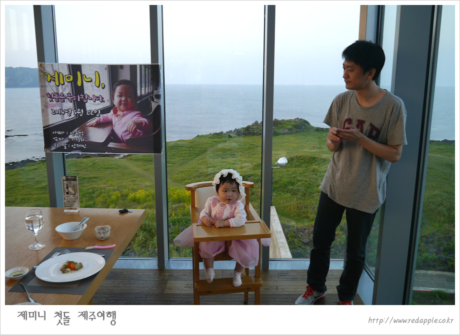 제주도에 도착하여 예약한 레스토랑에서 우리끼리 돌잔치했다 |