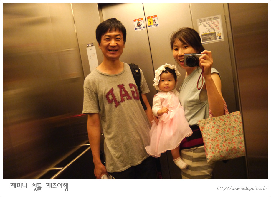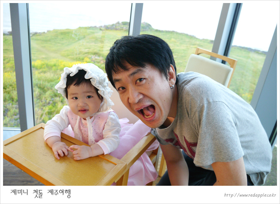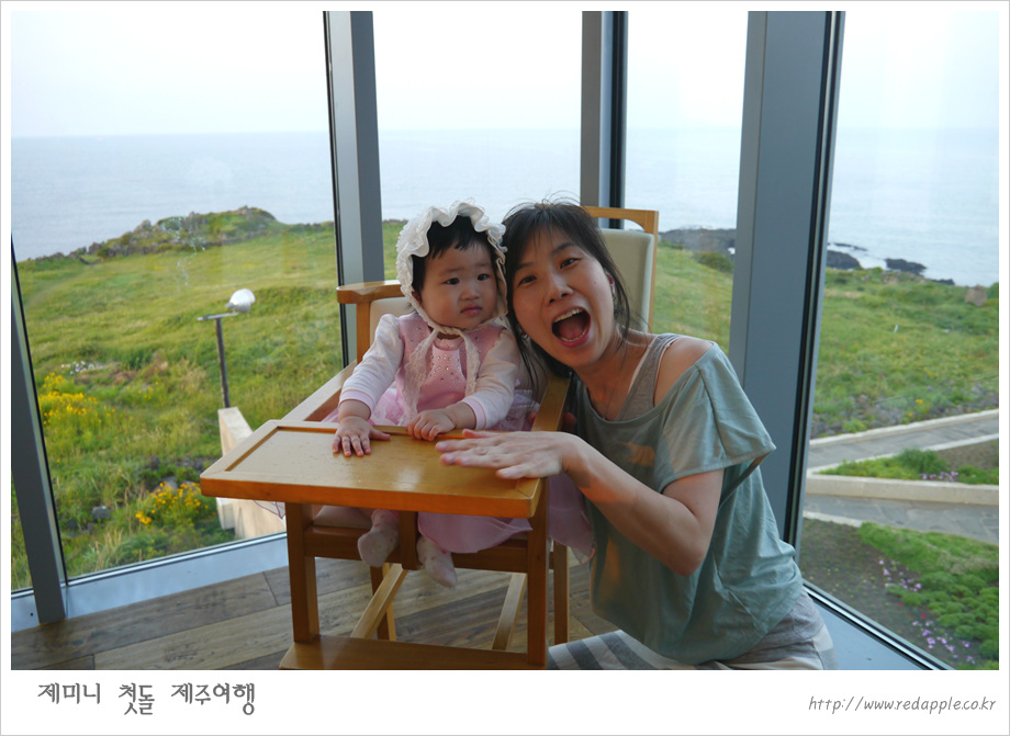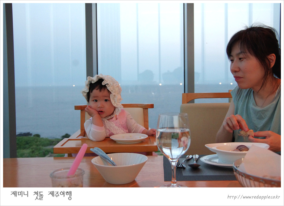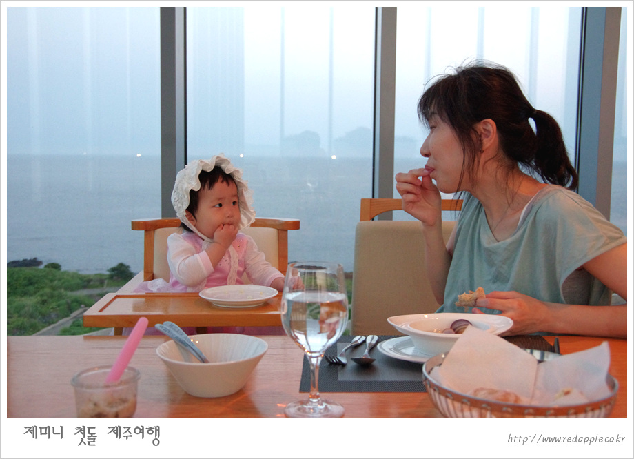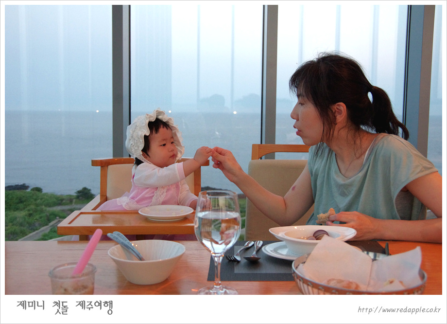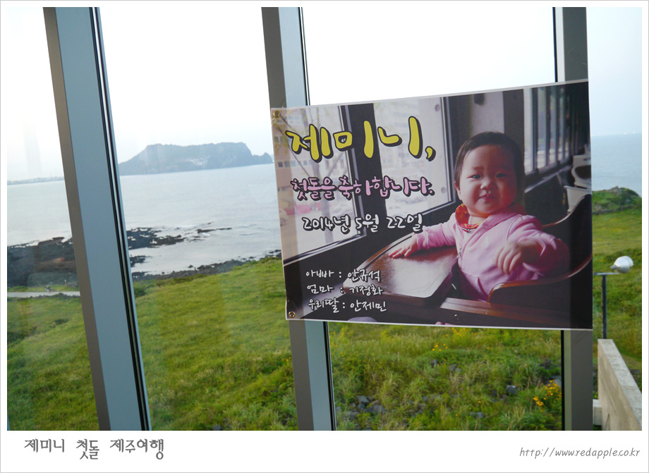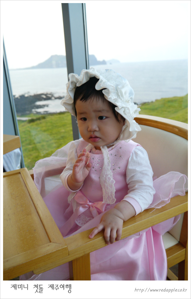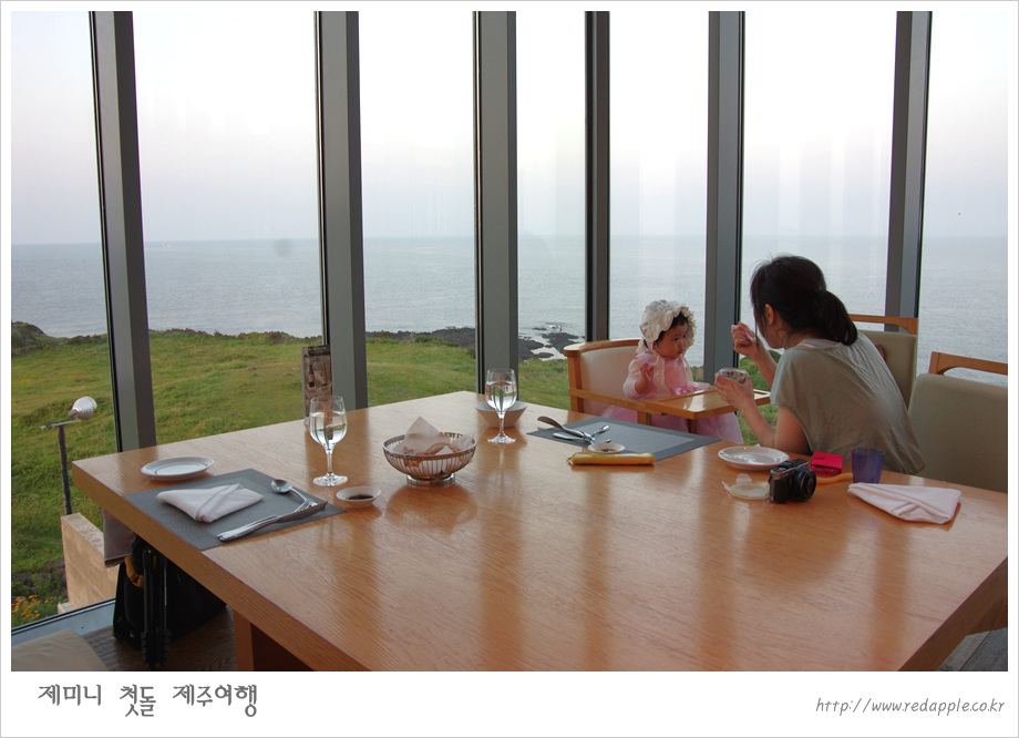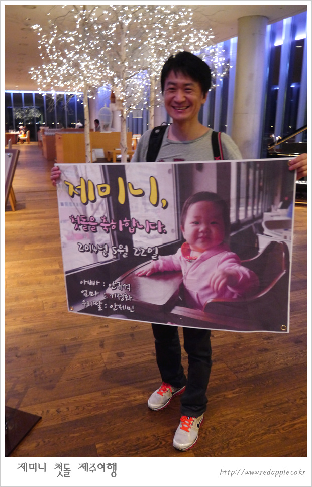 제주도에 도착하여 예약한 레스토랑에서 우리끼리 돌잔치했다 |